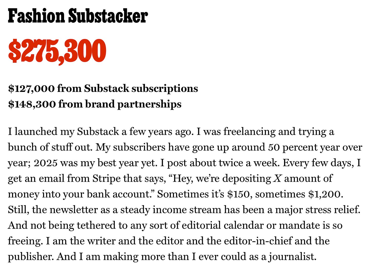 I understand why writers get pressed over someone making so much cash on Substack when many make so little, but I fear they’re misplacing their frustration/anger/jealousy/insert your own emotion, because this anonymous writer is nowhere near the summit of the high-earning fashion Substack pile. If they really want to wind themselves up then look no further than the two publications that sit at the top of the fashion category.